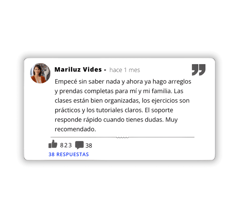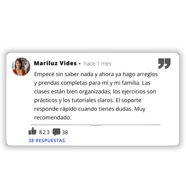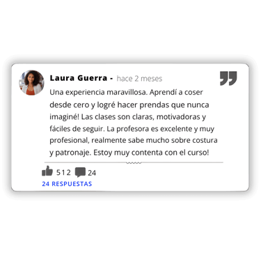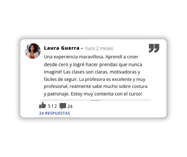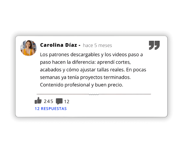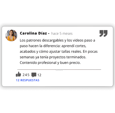 Hoy, a través de este curso, comparte un método probado que ha ayudado a cientos de estudiantes a aprender costura y patronaje desde cero, ganando seguridad, criterio y autonomía para crear, ajustar y transformar prendas con resultados reales.